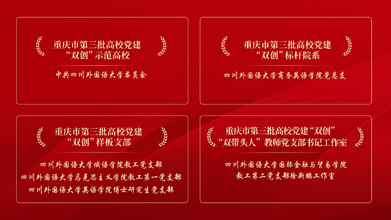 近日,市委教育工委公布全市第三批高校党建“双创”工作示范高校、标杆院系、样板支部、“双带头人”教师党支部书记工作室入库名单。学校党委入选党建“双创”示范高校,商务英语学院党总支入选党建“双创”标杆院系,俄语学院教工党支部、马克思主义学院教工第一党支部、英语学院博士研究生党支部入选党建“双创”样板支部,国际金融与贸易学院教工第二党支部徐新鹏工作室入选党建“双创”“双带头人”教师党支部书记工作室。学校实现示范高校、标杆院系、“双带头人”教师党支部书记工作室创建零的突破,样板支部数量再创新高。